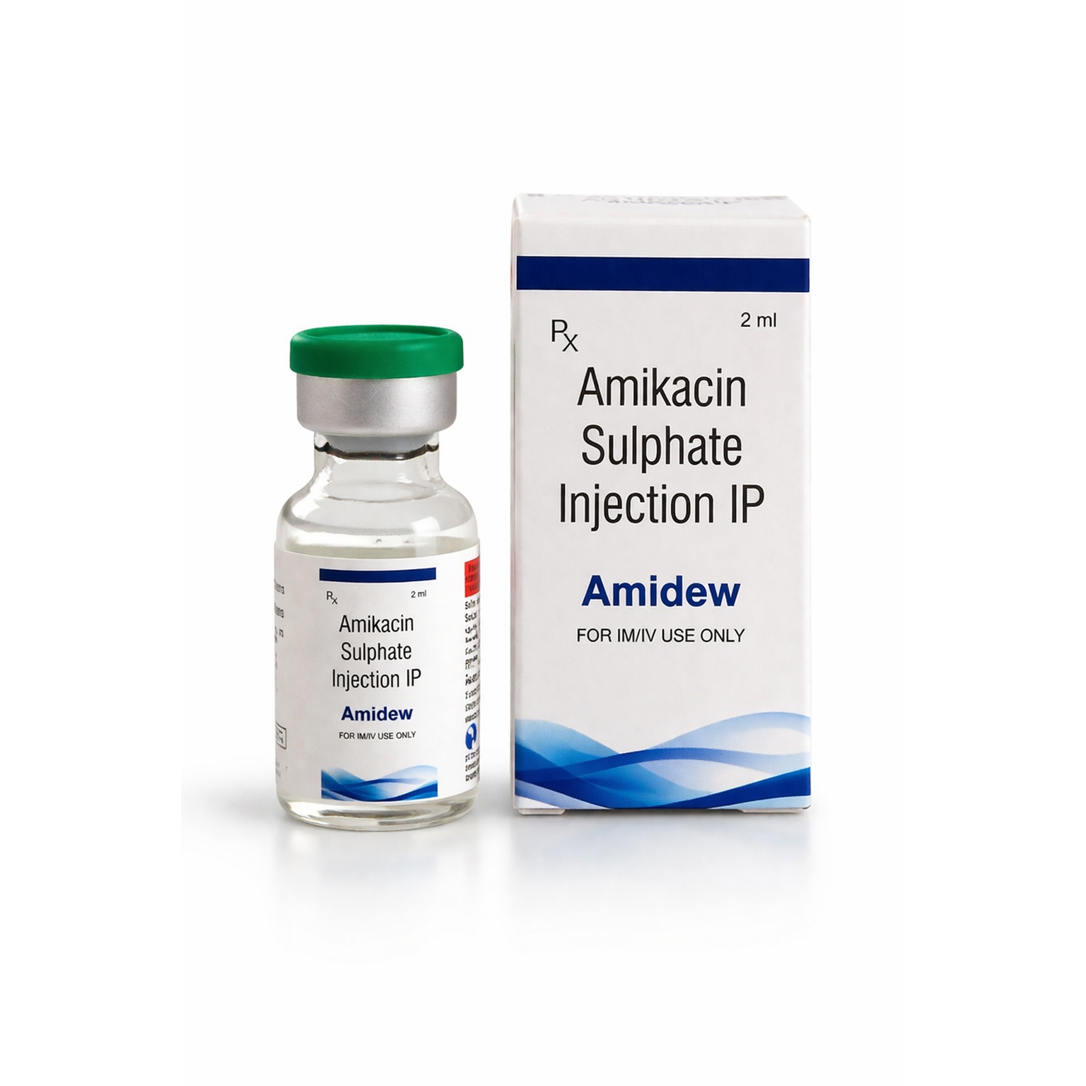 Description: Amidew (Amikacin Sulphate Injection IP) is a high-quality, sterile injectable antibiotic formulated to combat a wide range of serious bacterial infections. It contains Amikacin Sulphate, a potent aminoglycoside known for its effectiveness against resistant gram-negative bacteria and certain gram-positive organisms. Designed for intramuscular (IM) and intravenous (IV) administration, Amidew ensures rapid systemic action, making it a reliable choice in critical care and hospital settings. This formulation is widely used in the treatment of life-threatening and complicated infections, especially when other antibiotics may not be effective. Its strong bactericidal activity works by inhibiting protein synthesis in bacteria, ultimately leading to bacterial cell death. Due to its powerful action, Amidew is typically prescribed under strict medical supervision to ensure safe and effective outcomes. Amidew is indicated for a variety of infections, including lower respiratory tract infections, urinary tract infections (UTIs), septicemia (blood infections), intra-abdominal infections, bone and joint infections, skin and soft tissue infections, and post-surgical infections. It is particularly valuable in hospital environments where resistant bacterial strains are more common. Each 2 ml dose is carefully formulated to provide consistent potency and reliability. The product adheres to pharmaceutical quality standards, ensuring safety, purity, and efficacy. Its compact packaging also supports easy handling, storage, and transport in clinical environments. Key Benefits:- *Broad-spectrum antibiotic with strong bactericidal action *Effective against resistant and severe bacterial infections *Rapid onset of action via IM/IV administration *Suitable for hospital and clinical use *High-quality formulation meeting IP standards Storage Instructions:- Store in a cool, dry place away from direct light. Keep out of reach of children. Conclusion:- Amidew (Amikacin Sulphate Injection IP) is a powerful and reliable antibiotic injection designed to manage serious and resistant bacterial infections. Its fast-acting bactericidal properties and broad-spectrum effectiveness make it an essential option in critical care and hospital treatments. However, due to its potency, it should always be used under strict medical supervision, with proper dosage and monitoring to ensure safety and effectiveness. When used appropriately, Amidew plays a crucial role in controlling severe infections and improving patient outcomes.