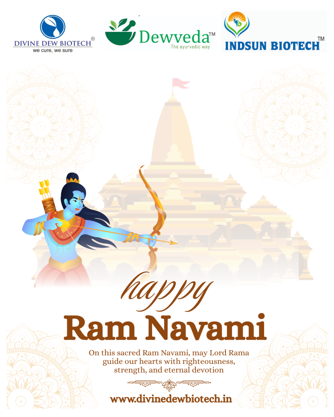 Description:- Celebrate the sacred festival of Ram Navami with devotion and positivity. This design beautifully portrays Lord Rama, symbolizing righteousness, strength, and virtue, set against a serene temple backdrop. The artwork reflects spiritual harmony and cultural richness, enhanced with traditional motifs and calming tones. On this auspicious occasion, may Lord Rama bless everyone with courage, wisdom, and unwavering faith. Divine Dew Biotech, along with Dewveda and Indsun Biotech, extends heartfelt wishes for peace, prosperity, and good health.