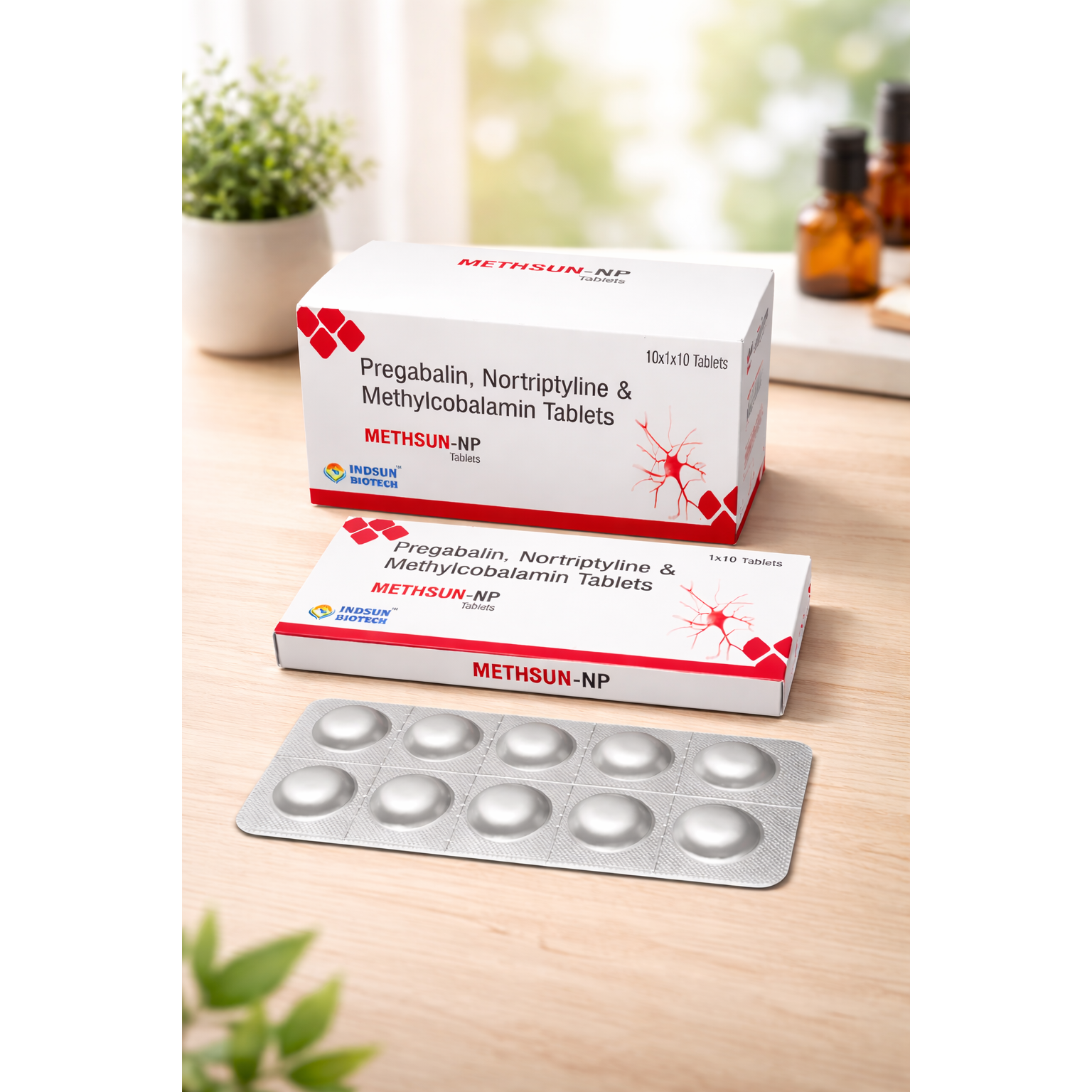 Compositions:- Pregabalin 75mg + Nortriptyline 10mg + Methylcobalamin 1500mcg Tablets Description:- METHSUN-NP Tablets is a scientifically developed combination of Pregabalin, Nortriptyline, and Methylcobalamin, specially formulated for the effective management of neuropathic pain and nerve-related disorders. This powerful triple-action therapy works synergistically to relieve pain, restore nerve function, and improve the overall quality of life in patients suffering from chronic nerve conditions. Neuropathic pain arises due to damage or dysfunction of the nervous system and is often characterized by symptoms such as burning sensation, tingling, numbness, and shooting pain. METHSUN-NP Tablets target the root cause of such conditions by combining the proven efficacy of its active ingredients. Pregabalin helps in reducing abnormal electrical activity in the brain and calms overactive nerves, thereby providing significant pain relief. Nortriptyline enhances the levels of certain neurotransmitters in the brain, helping to modulate pain signals and improve mood, which is often affected in chronic pain conditions. Methylcobalamin, an active form of Vitamin B12, plays a crucial role in nerve regeneration, repair, and maintenance of healthy nerve cells. This combination is widely recommended for conditions such as diabetic neuropathy, peripheral neuropathy, post-herpetic neuralgia, and other nerve-related disorders. Regular use under medical supervision not only helps in controlling pain but also supports long-term nerve health and prevents further nerve damage. METHSUN-NP Tablets are manufactured with high-quality standards, ensuring safety, efficacy, and consistent therapeutic outcomes. The convenient tablet form allows for easy administration and better patient compliance, making it an ideal choice for long-term treatment plans. Key Benefits:- *Provides effective relief from neuropathic pain *Helps reduce tingling, burning, and numbness *Supports nerve repair and regeneration *Improves patient comfort and daily functioning *Suitable for chronic nerve disorder management Usage:- METHSUN-NP Tablets are used for the management of neuropathic pain conditions such as diabetic neuropathy, peripheral neuropathy, and nerve damage-related discomfort. It helps relieve symptoms like burning sensation, tingling, numbness, and sharp shooting pain while supporting nerve health. Dosage:- The dosage of METHSUN-NP Tablets should be taken strictly as prescribed by a healthcare professional. *Usually taken once or twice daily, depending on the severity of the condition *Can be taken with or without food *Do not exceed the recommended dose *Do not stop the medication abruptly without consulting a doctor Storage:- *Store in a cool and dry place below 25°C *Protect from direct sunlight and moisture *Keep out of reach of children *Do not use the medicine after the expiry date mentioned on the pack Conclusion:- METHSUN-NP Tablets offer a reliable and effective solution for managing nerve-related pain and improving nerve function. With its powerful combination formula, it not only provides symptomatic relief but also supports long-term nerve health, making it a trusted choice for both patients and healthcare professionals.